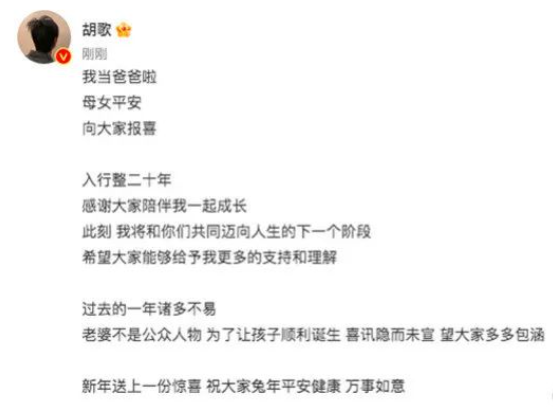 1月31日,胡歌发文宣布结婚生女的喜讯,他表示:“我当爸爸啦,母女平安,向大家报喜。”据胡歌透露,妻子是圈外人,所以不公开身份,目前胡歌感恩粉丝和观众对他的支持,也宣布胡歌迈入新的人生阶段,当了丈夫和爸爸了。